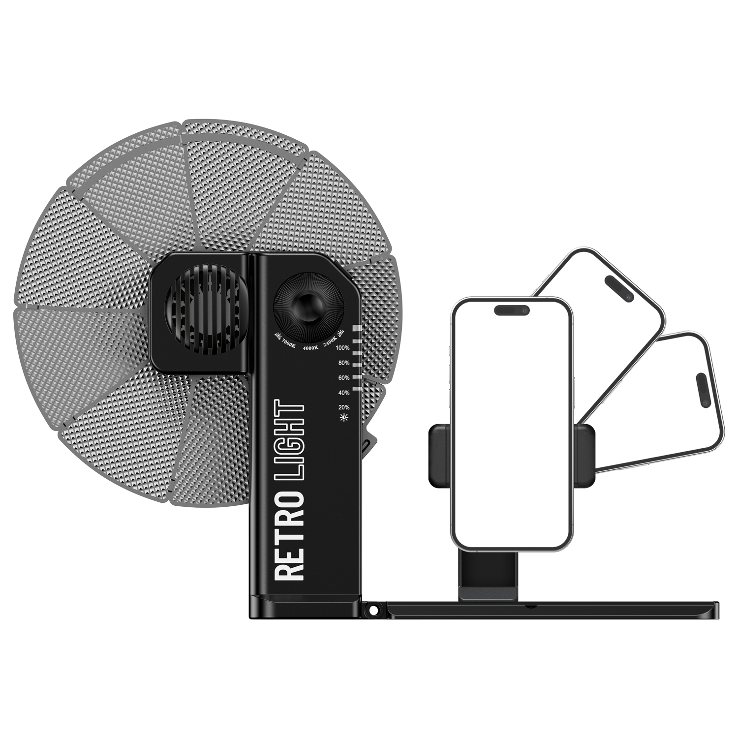 You will receive a complete ready-to-use kit: The Retro Light main body, Soft Light Diffuser, Phone Clip, Type-C Charging Cable, Cold Shoe Mount + Camera Bracket, and 2x Hand Screws.